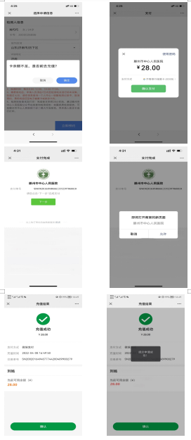 4、若就診卡余額不足,則彈出充值提示,點擊充值進入充值界面。充值完成后,點擊下一步,點擊確定,會直接提交申請,如下圖: