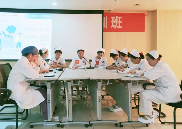 討論會圍繞一例子宮內膜癌術后出現肺栓塞并發癥轉ICU治療的危重患者展開。責任護士孫玲玲進行病例匯報,護理骨干張立新帶領大家完成小組討論。