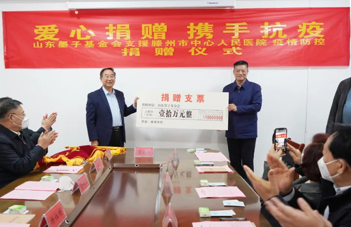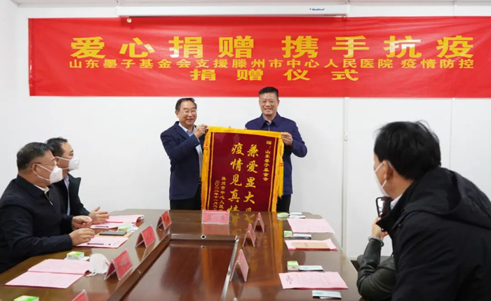 捐贈儀式上,山東墨子基金會理事長楊位明同志表示,滕州自疫情發生以來,以滕州市中心人民醫院為代表的所有醫務人員,奮戰在抗疫一線,舍小家,顧大家,用自己的熱血和擔當,為滕州的疫情防控工作做出突出貢獻。今天,墨子基金會在有限的資金里,拿出部分捐款進行捐贈,希望可以用愛傳遞愛,用行動傳遞行動,帶動更多的愛心企業家和愛心人士參與到疫情防控捐贈活動中來,為全市的疫情防控做出應有的貢獻。