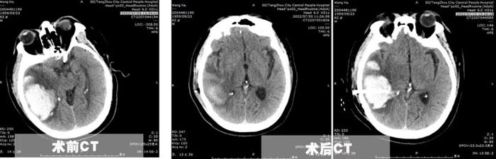 為了在最恰當的手術時機及時完成手術,7月10日,李永濤主任放棄在家休息的時間,帶領陳凡宇主治醫師,在局麻下為患者完成顱骨鉆孔腦出血引流術。術中僅在切口線注入5ml利多卡因,然后顱骨鉆孔形成直徑約1cm骨孔,切開硬腦膜后精準置入直徑約5mm的硅膠引流管于血腫腔,術后復查CT并引流管內注入尿激酶促進血腫引流。經過3天的引流,血腫基本排除,腦壓下降,癥狀改善。同時盡早給予患者床旁肢體功能康復,并積極調整患者血糖、血壓、及心臟功能,給予患者精神鼓勵和心理輔導。患者出院的時候已經能夠獨立行走,生活自理。