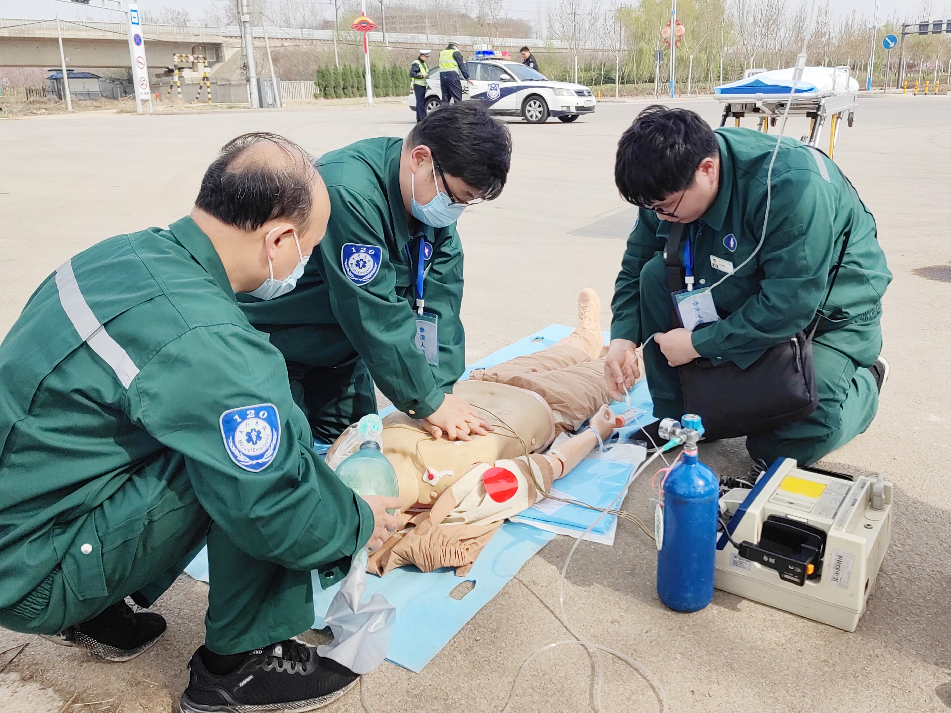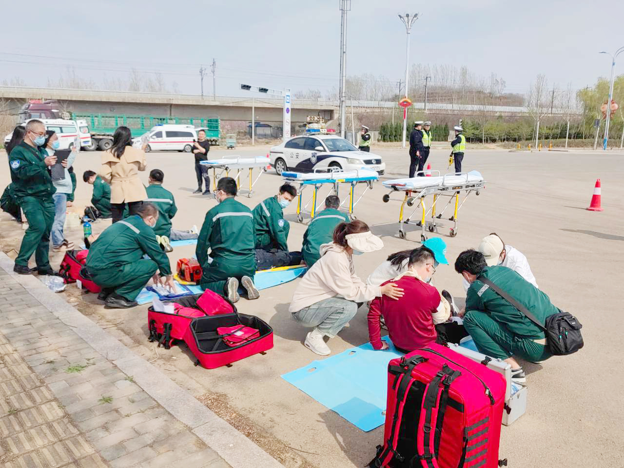 15:30演練正式開始。演練場景為高速公路發(fā)生多車相撞,造成多人不同程度受傷。院前急救接到出車指令后立即調(diào)派多輛救護(hù)車趕赴現(xiàn)場,調(diào)度員立即向科主任匯報。到達(dá)現(xiàn)場后,院前醫(yī)生快速分類檢傷發(fā)現(xiàn)有6名傷員(模擬),其中一人當(dāng)場死亡(模擬),其余5名傷員(模擬)頭部、軀干、四肢不同程度受傷。交警立即封閉道路,封鎖事故現(xiàn)場,拉起警戒線,為現(xiàn)場救治提供安全保障。