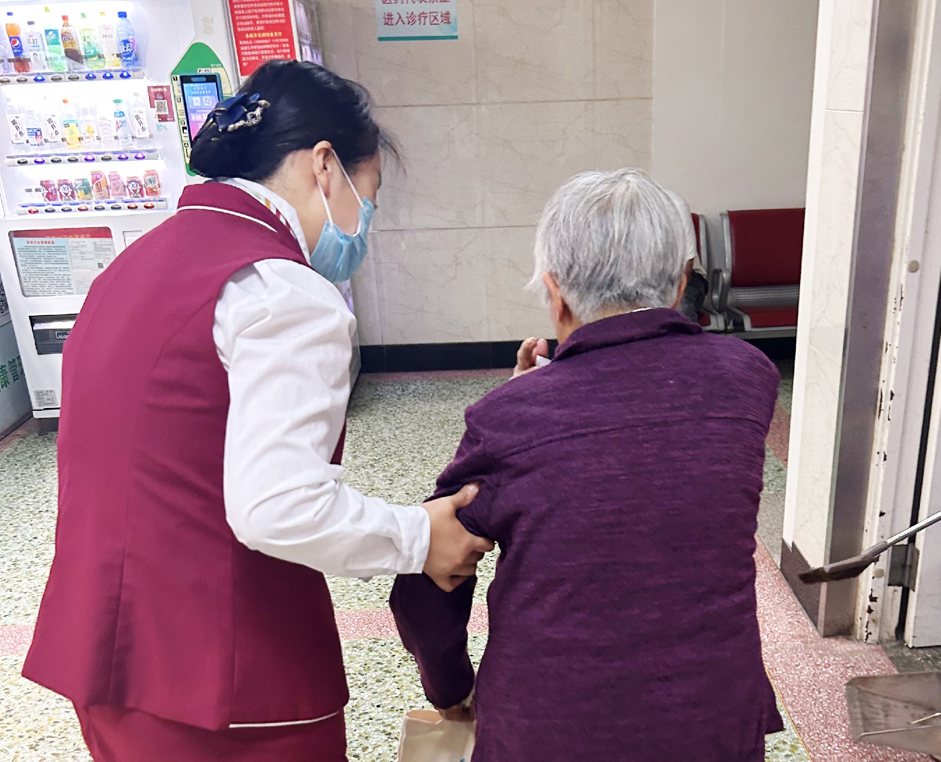 8月16日早8時左右,助老驛站導服李霞在人群中發現兩位老年人拿著一個藥盒步履蹣跚地走著,李霞立刻上前詢問。溝通后得知,這對老年人已經看完醫生,購買的藥品需領取申請表,走流程簽字,由于患者年齡較大,不清楚具體流程,非常著急。李霞當即聯系巡崗人員,安排好自己的崗位,帶領患者辦理藥品申請,直至將兩位老年人送出門診大廳。