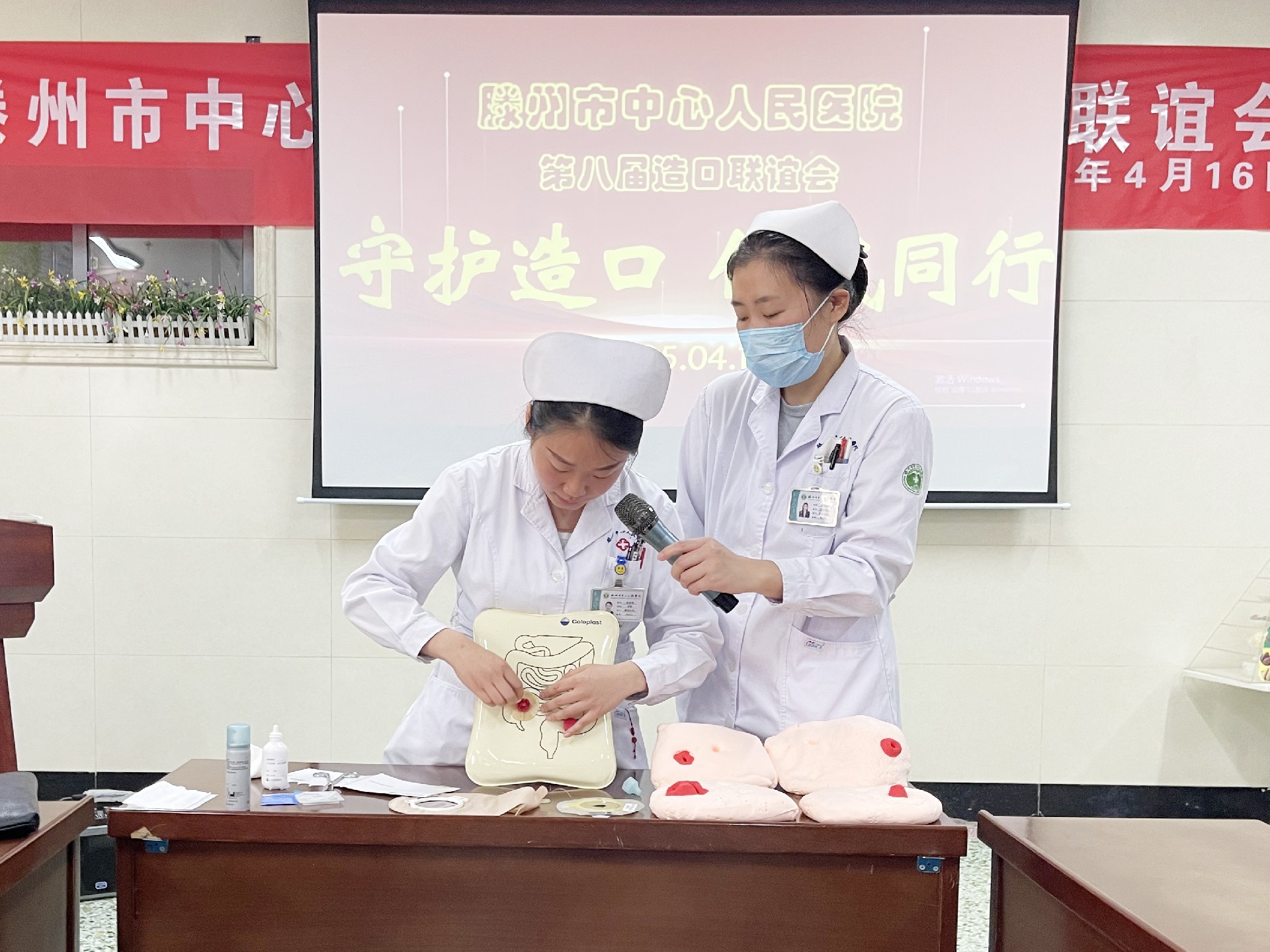 會議設置了知識講座、流程演示、有獎競答、現場答疑等環節。肛腸外科副主任曹成波做“結直腸腫瘤的前世今生”講座,從專業角度講述大腸腫瘤的病因、預防篩查及術后全程康復管理。邵鵬護士長對造口并發癥的預防護理、造口人士日常生活中如何穿衣、運動、飲食、沐浴等進行了詳細的講解。張亭亭、楊秀娟護士現場演示造口護理及造口袋更換流程、粘貼固定技巧。