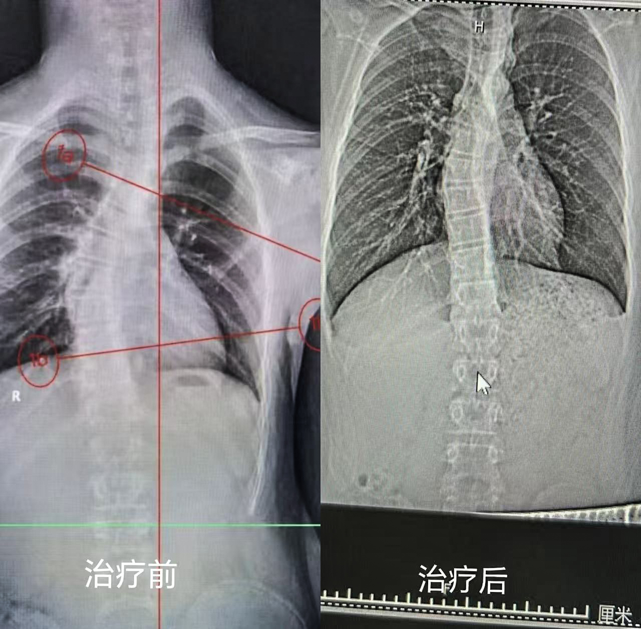 患者,男,14歲。2024年在滕州市學生常見病(四防三進)防控專家進校園活動中發現脊柱側彎,遂來我院拍攝脊柱全場正位片,確診脊柱側彎,(T5-T10:28°),且存在高低肩(高低),含胸、頭部前引,頸后大包(富貴包)等問題。通過精準評估后,以施羅斯訓練法為基礎進行專項矯正訓練。經過三個月的干預后,脊柱側彎較前改善。