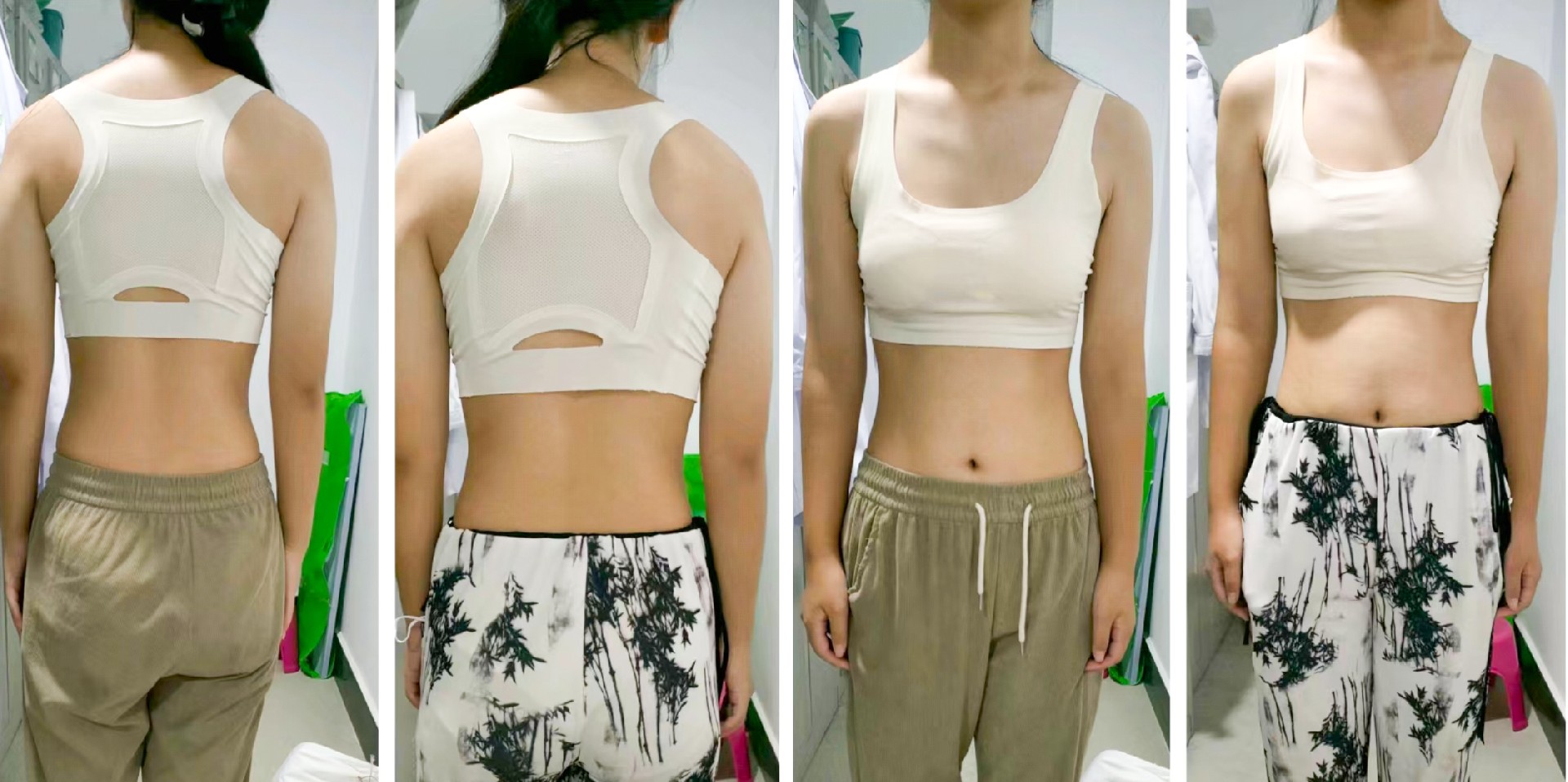 患者,女,13歲。2024年在滕州市學生常見病(四防三進)防控專家進校園活動中查體發現體態異常,含胸駝背、剃刀背明顯,脊柱側彎(T8-L3:13°)。每周在我院康復醫學科行康復訓練一次,經過4個月康復訓練,復查脊柱側彎(T8-L3:8°),含胸駝背體態較前改善明顯。