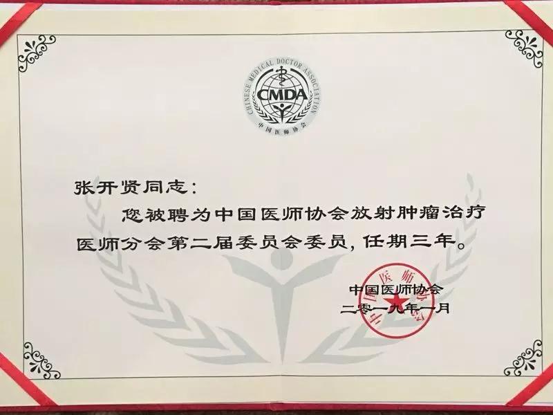 張開賢主任當選中國醫師協會放射腫瘤治療醫師分會全國委員