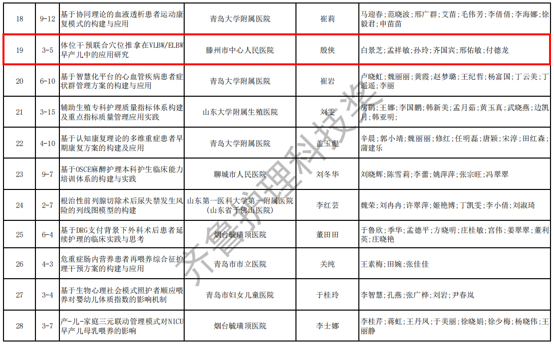 近日,2024年齊魯護理科技獎獲獎名單公布,我院護理科研/護理部申報的《體位干預聯合穴位推拿在VLBW/ELBW早產兒中的應用研究》,從百余項申報項目中脫穎而出,榮獲本年度齊魯護理科技獎三等獎。這是我院榮獲“齊魯護理科技獎”的首個護理科研課題,同時也是2024年棗莊地區唯一獲獎項目。