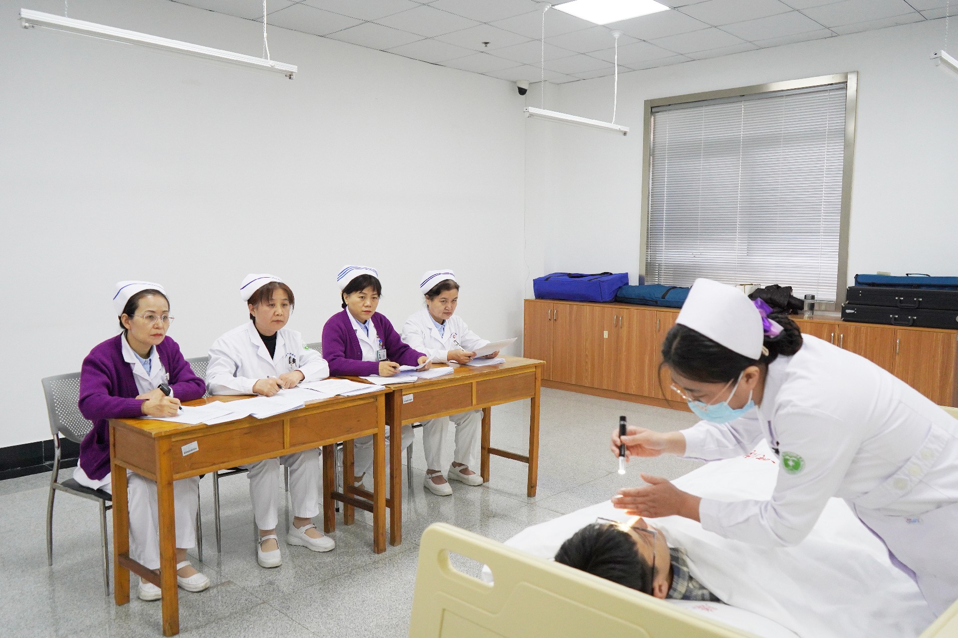 當日上午,護理床邊綜合能力競賽率先打響。在大內科護士長劉允霞指引下,護理精英們紛紛登場,各顯神通。在患者評估環節,護理人員們細致入微,不放過任何一個可能影響患者病情判斷的細節,通過觀察、詢問、檢查等多種方式,快速而準確地對患者的身體狀況做出評估;護理查體,是護士與患者身體接觸、了解病情的重要環節,護理人員手法輕盈而嫻熟,每一個動作都力求精準無誤,最大程度減輕患者的痛苦;護理人員們細心地對患者進行全面評估,從病情評估到護理查體,每一個環節都盡顯專業與溫情。