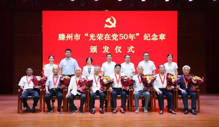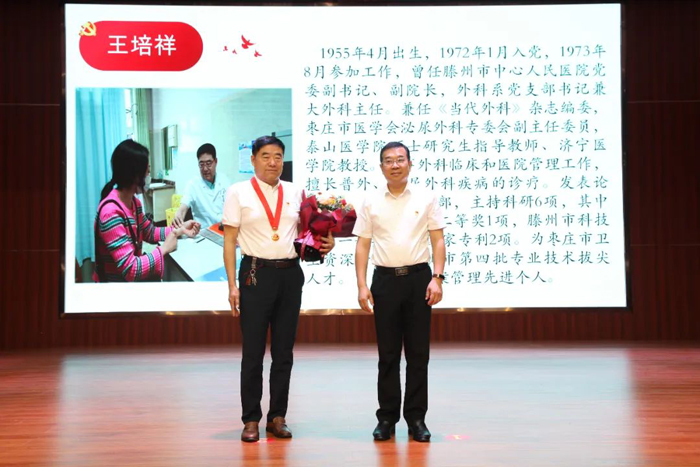 6月14日上午,我市舉行“光榮在黨50年”紀念章頒發(fā)儀式。滕州市委常委、組織部部長李義為我院退休干部王培祥同志頒發(fā)紀念章。