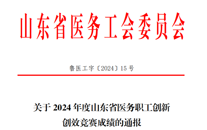 近日,山東省醫務工會委員會印發《關于2024年度山東省醫務職工創新創效競賽成績的通報》。