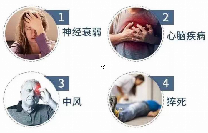 如今研究已經(jīng)證實(shí),如果長(zhǎng)期的睡眠問題得不到解決,可導(dǎo)致高血壓、2型糖尿病、冠心病、心律失常特別是以慢-快心律失常為主、腦卒中、肺源性心臟病、神經(jīng)衰弱等,還會(huì)伴隨進(jìn)行性體重增加。