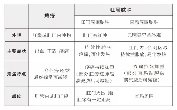 為了更容易區(qū)分痔瘡和肛周膿腫,專家總結(jié)一張表,將外觀、癥狀、疼痛特點(diǎn)及發(fā)病部位等逐一進(jìn)行對(duì)比。