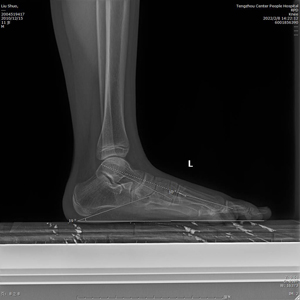 術中C型臂透視見:制動器位置良好,模擬左足負重試驗,患者足弓恢復良好。整個手術時間短,創傷小,見效快,僅用時30分鐘,微創刀口1cm,出血量不足5ml。術后左足石膏固定,2天后出院。?