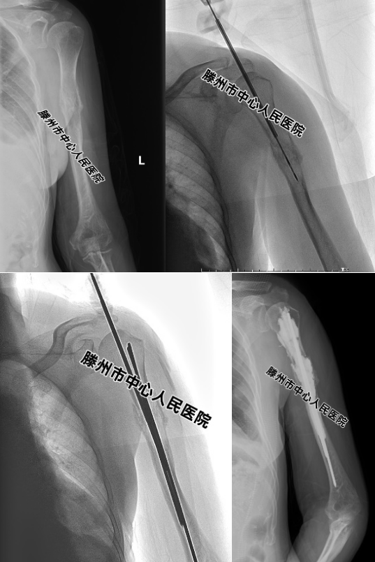 患者,女,62歲,因“咳嗽伴右上肢疼痛1個月”,在本院診斷為“肺腺癌并右肱骨轉移”。先進行放療,效果不佳,右上肢疼痛難忍,不能活動,CT、MRI及拍片檢查發現右側肱骨溶骨性轉移,骨皮質破壞明顯,隨時都有發生病理性骨折的風險。