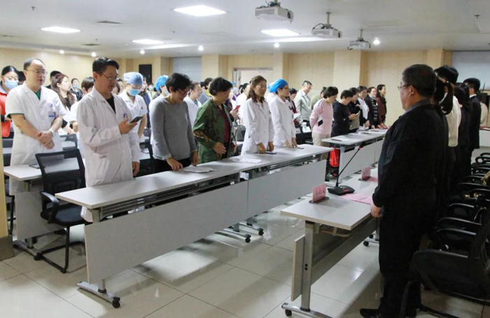會上,院團委書記崔艷宣讀活動方案。院黨委副書記馬瑞武宣布培訓班正式開始并提出要求,他希望大家要以這次活動契機,不斷陶冶藝術情操,豐富精神文化生活,提高職工的自豪感、幸福感,為醫院增添更加濃厚的文化氛圍;希望合唱團成員發揚團結協作精神,弘揚時代主旋律,共同建設好“合唱團”這個自己的藝術之家,以精彩的演唱向院慶70周年獻禮。