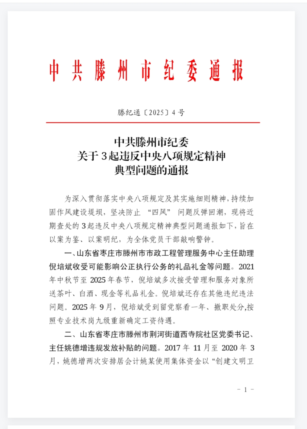 中共滕州市紀委通報 滕紀通〔2025〕4 號